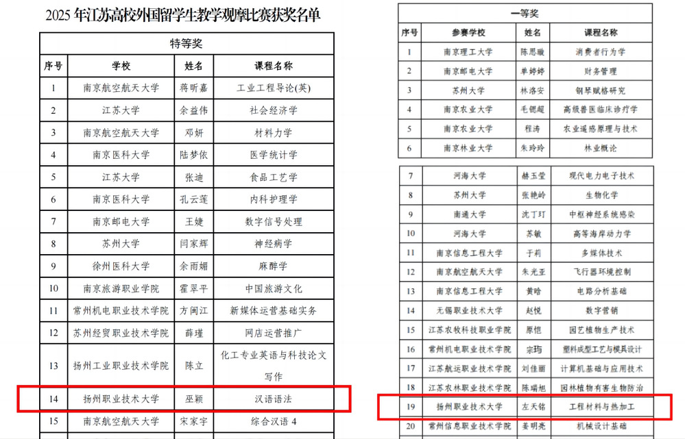 近日,2025年江苏高校外国留学生教学观摩比赛决赛在南京邮电大学举办。本次比赛设四个赛道,分别是全英文授课课程、国际中文教育、中国国情教育(含综合概况类和专业特色类课程)和留学生课程教学创新,全省来自61所高校的173位教师参加角逐。我校国际交流学院巫颖老师的《汉语语法》在国际中文教育赛道荣获特等奖,机械学院左天铭老师的《工程材料与热加工》在全英文授课课程赛道荣获一等奖。